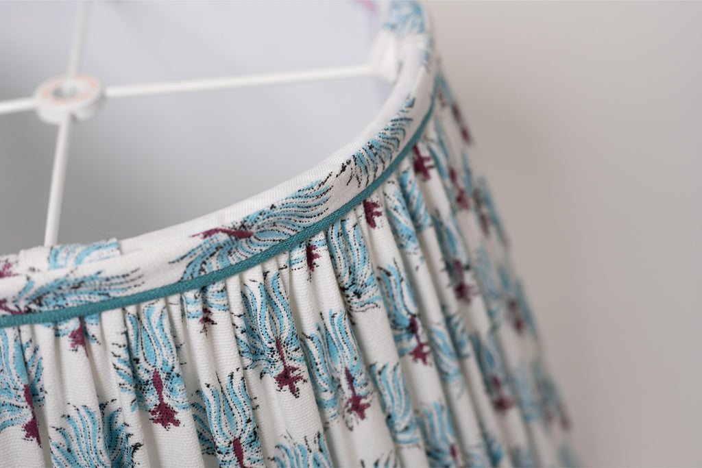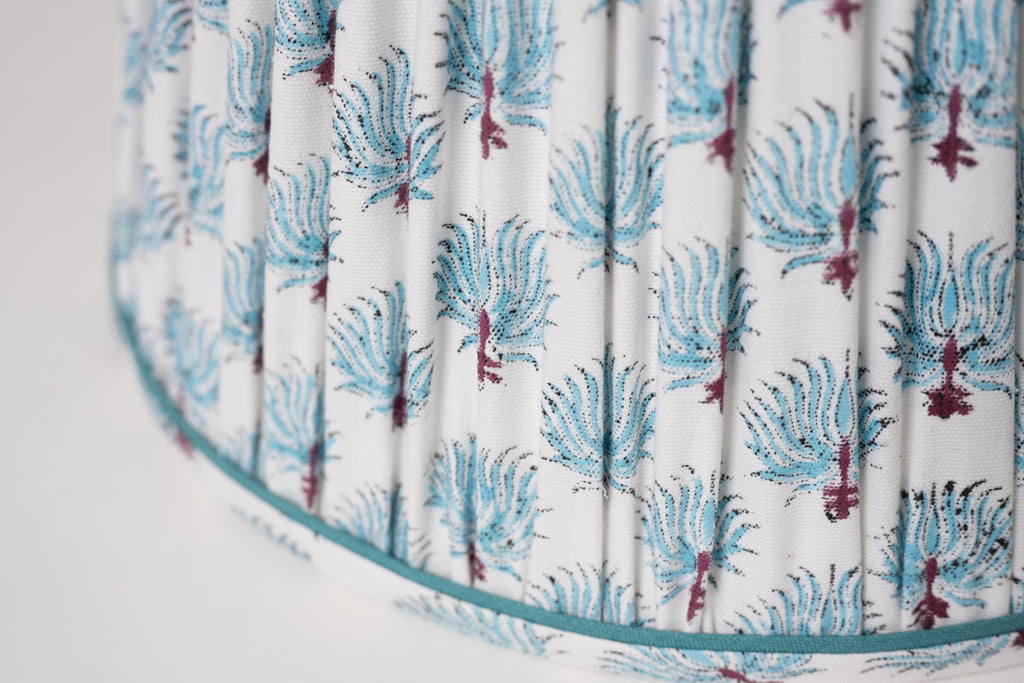 Imported from Jaipur, this cotton lampshade is a classic Jaipur design. The trim features a skinny band of matching turquoise linen. Whimsical and bright!