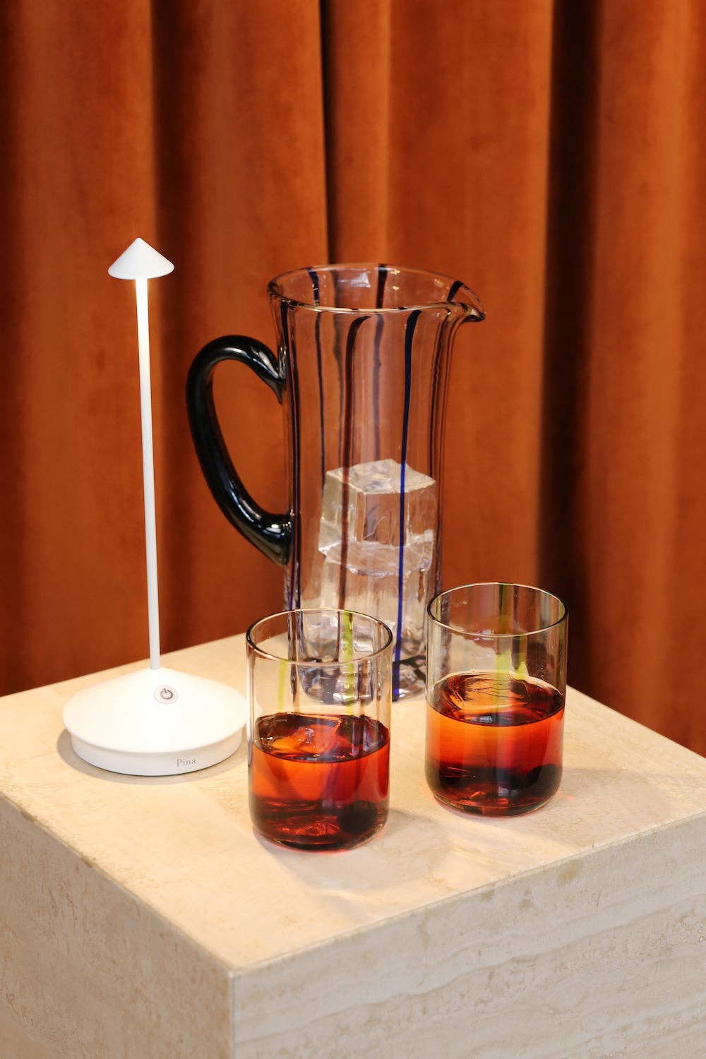 To recharge your Pina Pro lamp, plug the provided charging base into an outlet and place the lamp on the base. The button on the base glows red while charging and turns off once the charge is complete.